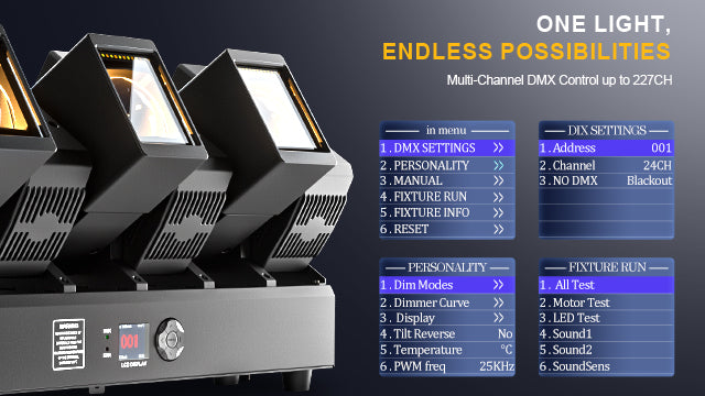 DMX512, Fonctionnement automatique, Mode maître-esclave, Contrôle sonore, compatible avec la fonction RDM