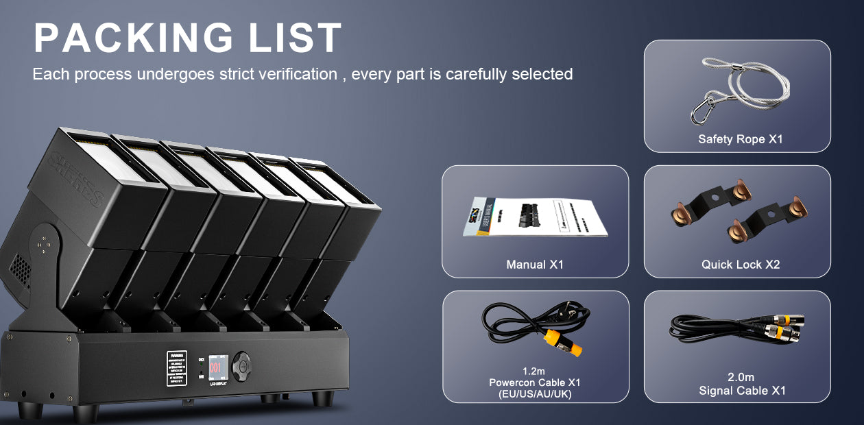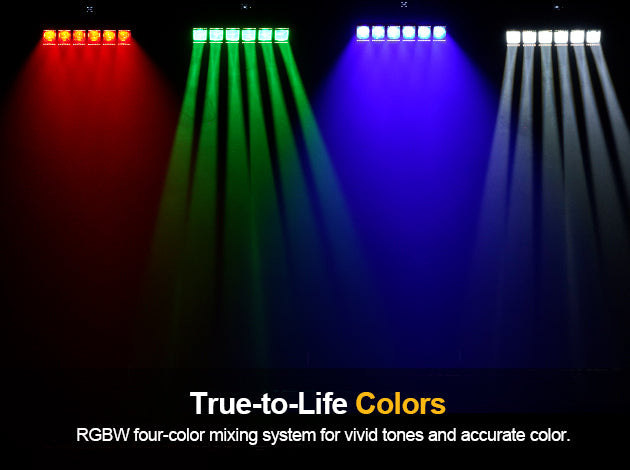 équilibréeL'optique composite avancée garantit un mélange de couleurs fluide et homogène. Le système RGBW délivre des teintes riches et vives ainsi que des faisceaux blancs nets — constants et fidèles à la réalité.