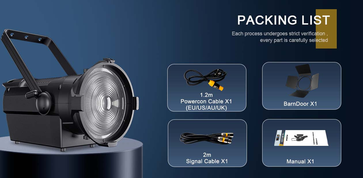 Le Spot Zoom 250W/350W est conçu pour les environnements professionnels exigeant un éclairage de haute qualité et aux couleurs fidèles. Sa polyvalence le rend idéal pour les théâtres, les studios de télévision, les productions cinématographiques et les événements en direct, où un rendu précis des couleurs et un éclairage doux et diffus sont essentiels.