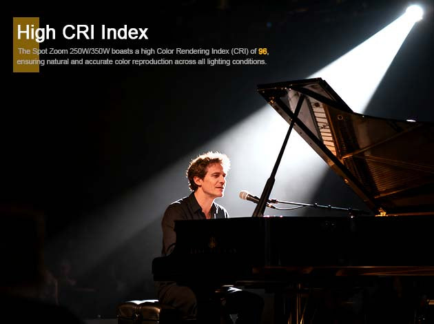 Le Spot Zoom250W/350W bénéficie d'un indice de rendu des couleurs (IRC) élevé de 96, garantissant une reproduction des couleurs naturelle et précise dans toutes les conditions d'éclairage.