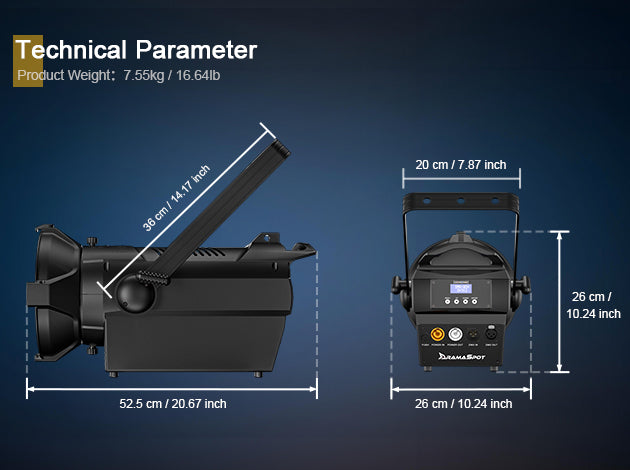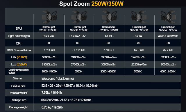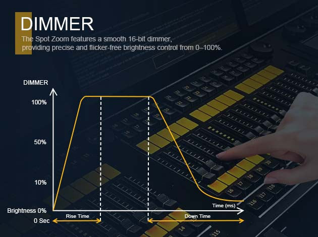 Le Spot Zoom250W/350W est doté d'un variateur 16 bits fluide, offrant un contrôle précis et sans scintillement de la luminosité de 0 à 100 %.